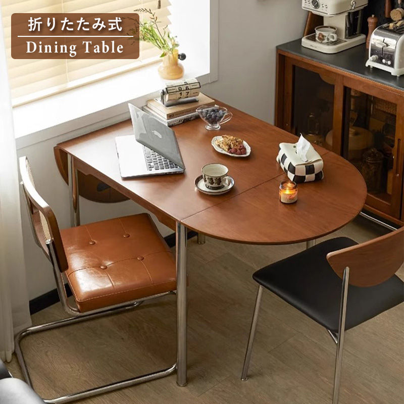 特徴のひとつは、サイドの天板を開いて拡張できる折りたたみ式の展開機構。幅は76cmから150cmまで調整可能で、1人~4人での食卓利用だけでなく、ワークデスクとしても柔軟に対応できます。